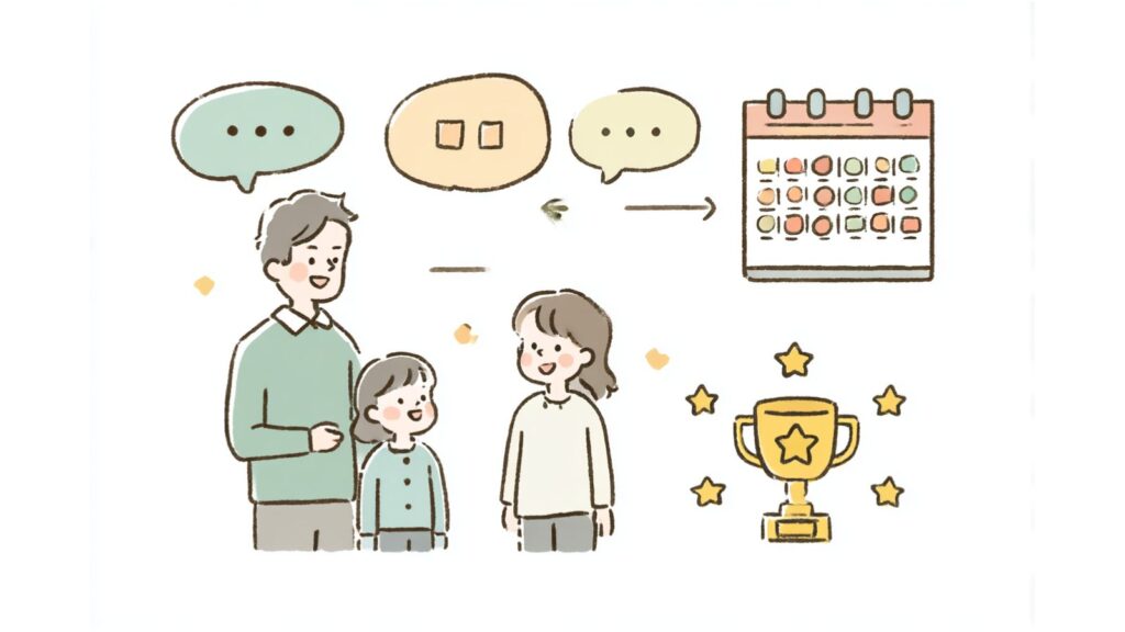 - ・見える化:リビングにカレンダー/チェック表。達成をシールで可視化。