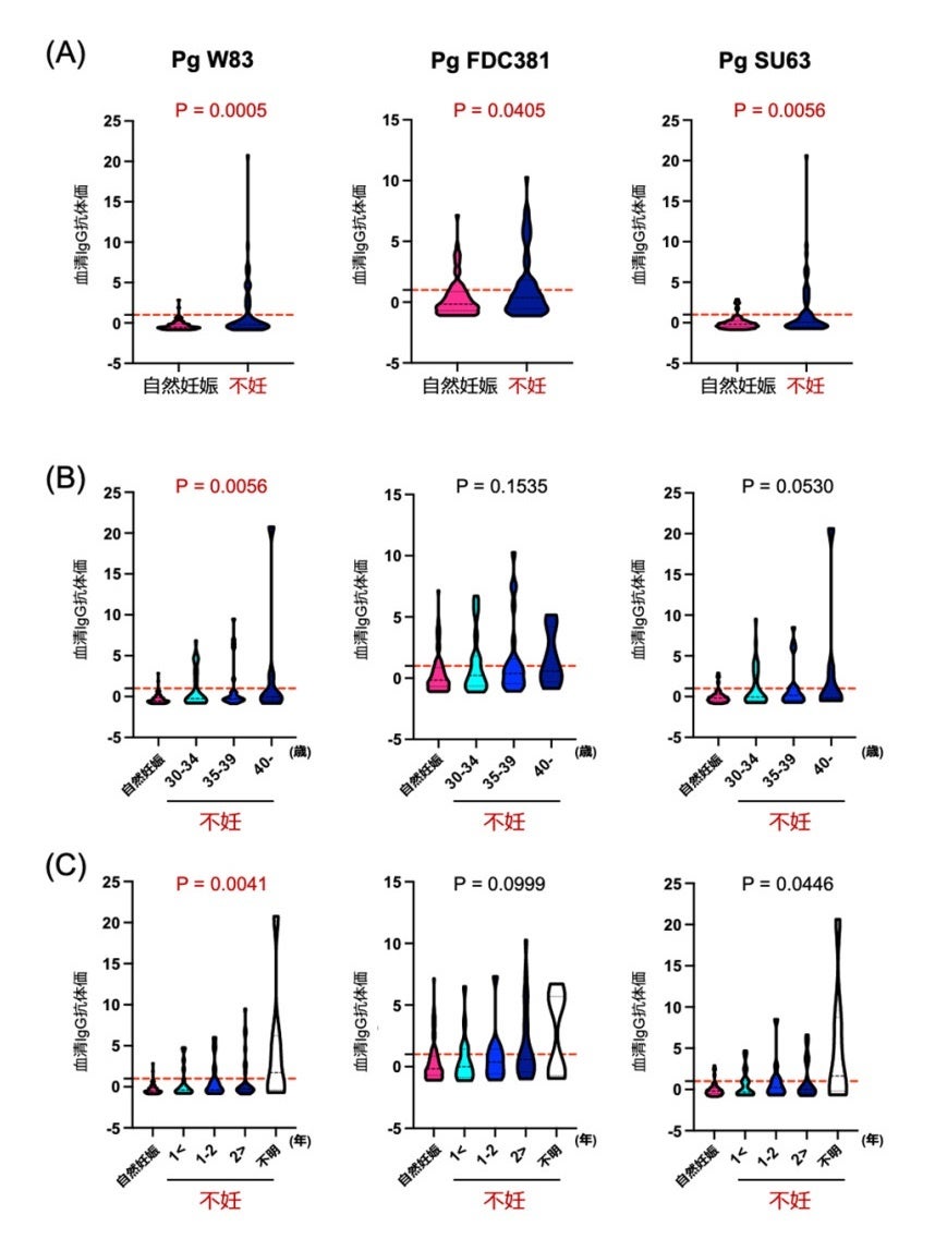 不妊治療中の患者さんでは、自然妊娠した妊婦さんに比べ、歯周病原細菌であるPorphyromonas gingivalis(Pg菌)の感染度が有意に高い傾向にあることを確認しました。