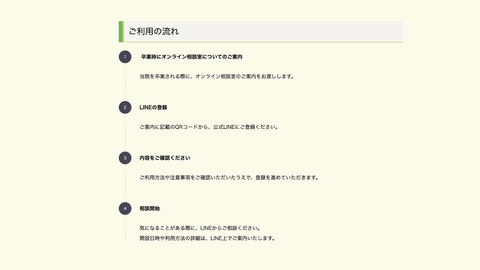 - 当院を卒業される際に、オンライン相談室のご案内をお渡しします
