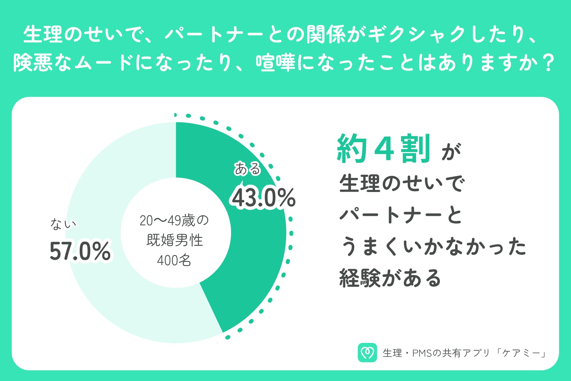 「生理のせいでパートナーとの関係がギクシャクしたり、険悪なムードになったり、喧嘩になったことがある」と答えた男性は全体の約4割(43%)にのぼりました。