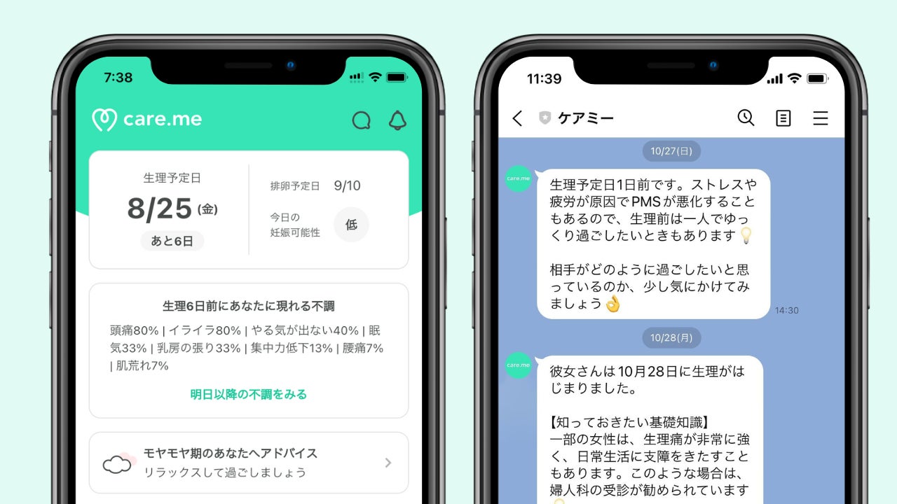 ケアミーは、生理やPMSをLINEでパートナーに共有できる産婦人科医監修のアプリです。「生理やPMSのことを自分からは伝えづらく、パートナーに理解してもらえない」という悩みを解決します。