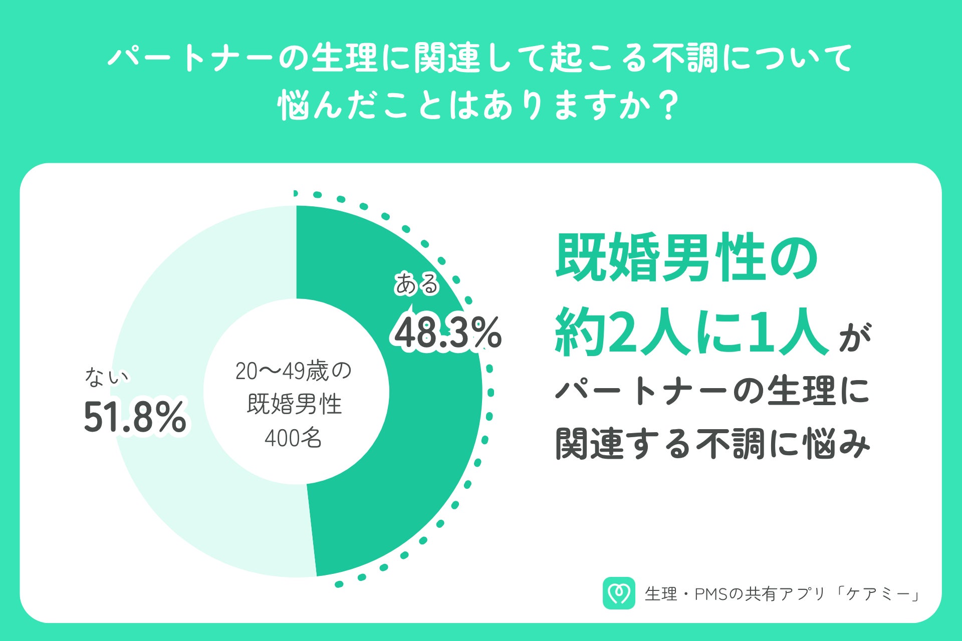 生理・PMS(※)の共有アプリ「ケアミー」を運営する株式会社ヘルスアンドライツ(本社:東京都渋谷区、代表取締役:吉川雄司)は、11月22日の「いい夫婦の日」に合わせ、20~49歳の既婚男性400名を対象に、「パートナーの生理に関連する不調についての悩み」をテーマに調査を実施しました。
