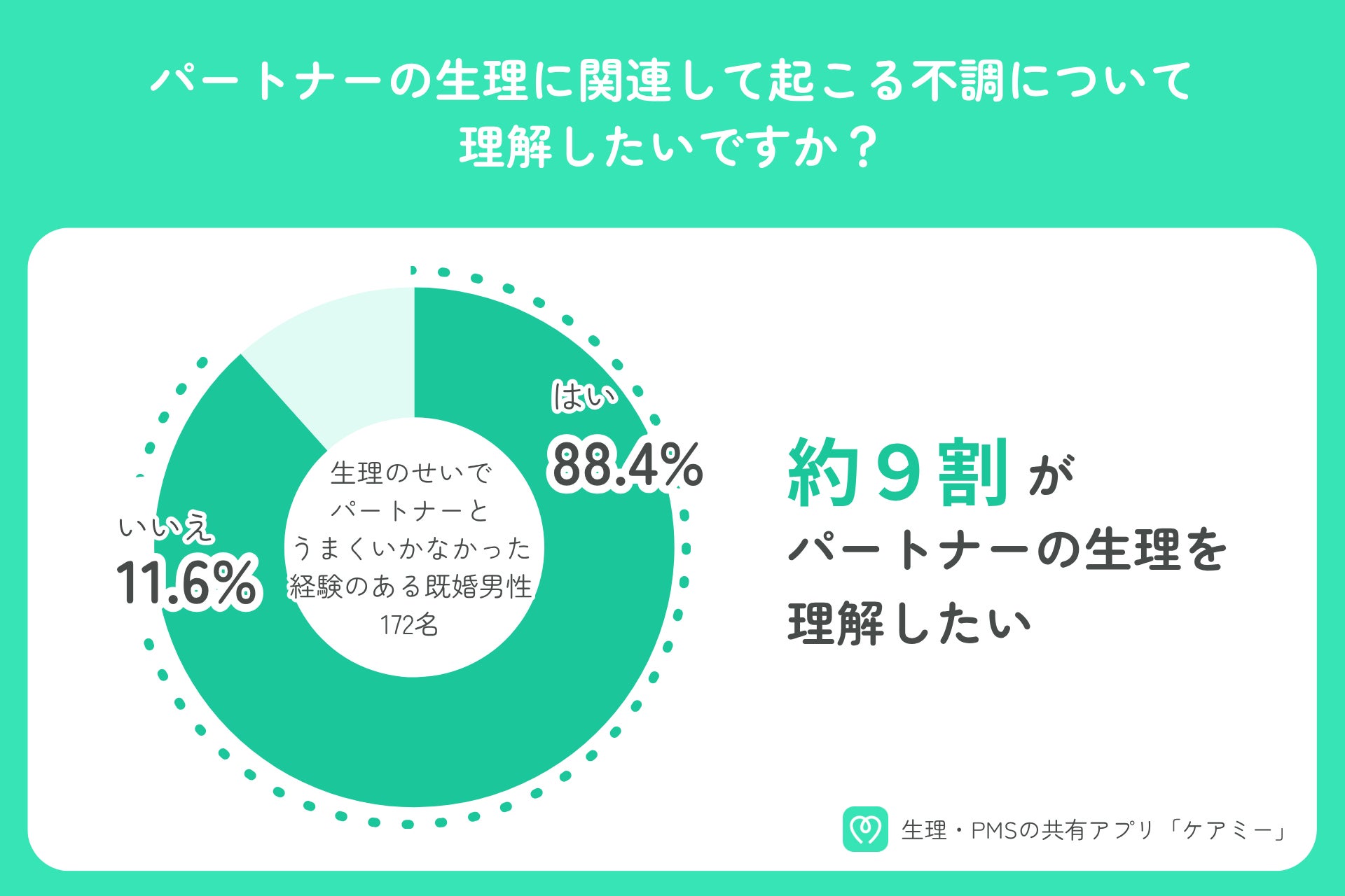 生理が原因でパートナーとうまくいかなかった経験のある男性のうち、約9割(88.4%)が「生理に関連して起こる不調について理解したい」と回答。多くの男性がパートナーとの関係を良好に保つために”理解したい”という気持ちを持っている一方で、「どのように寄り添えばいいのか分からない」という声も多く聞かれました。
