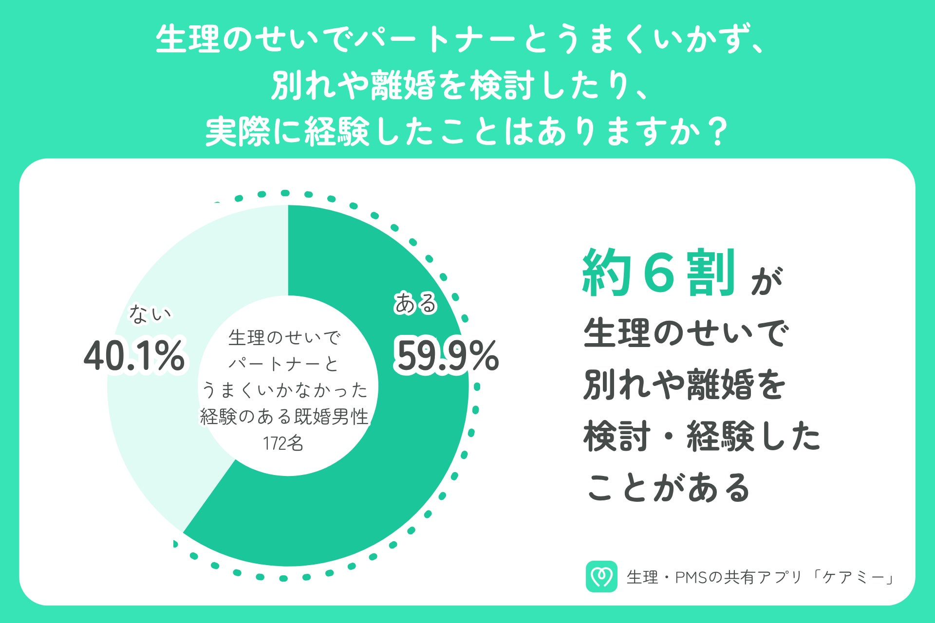 調査の結果、既婚男性の約2人に1人が「パートナーの生理に関連する不調に悩んだ経験がある」と回答。さらに、4割が「生理が原因でパートナーとうまくいかなかった経験がある」と答え、そのうち6割が「別れや離婚を検討・経験した」という結果となりました。